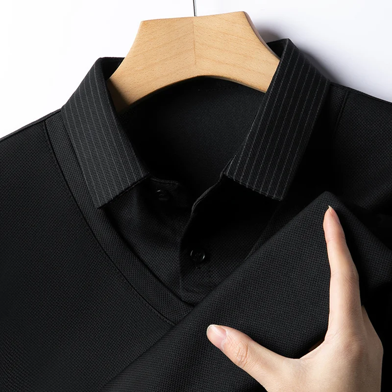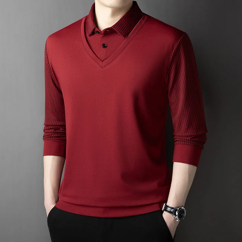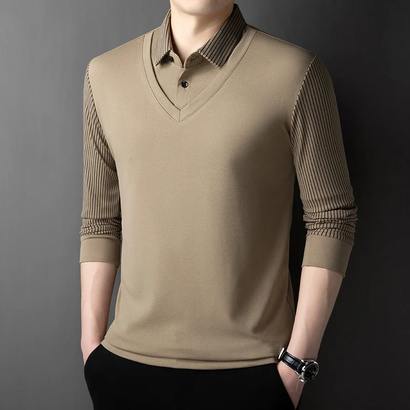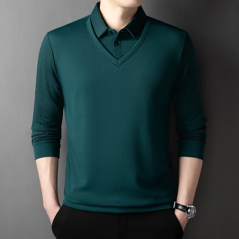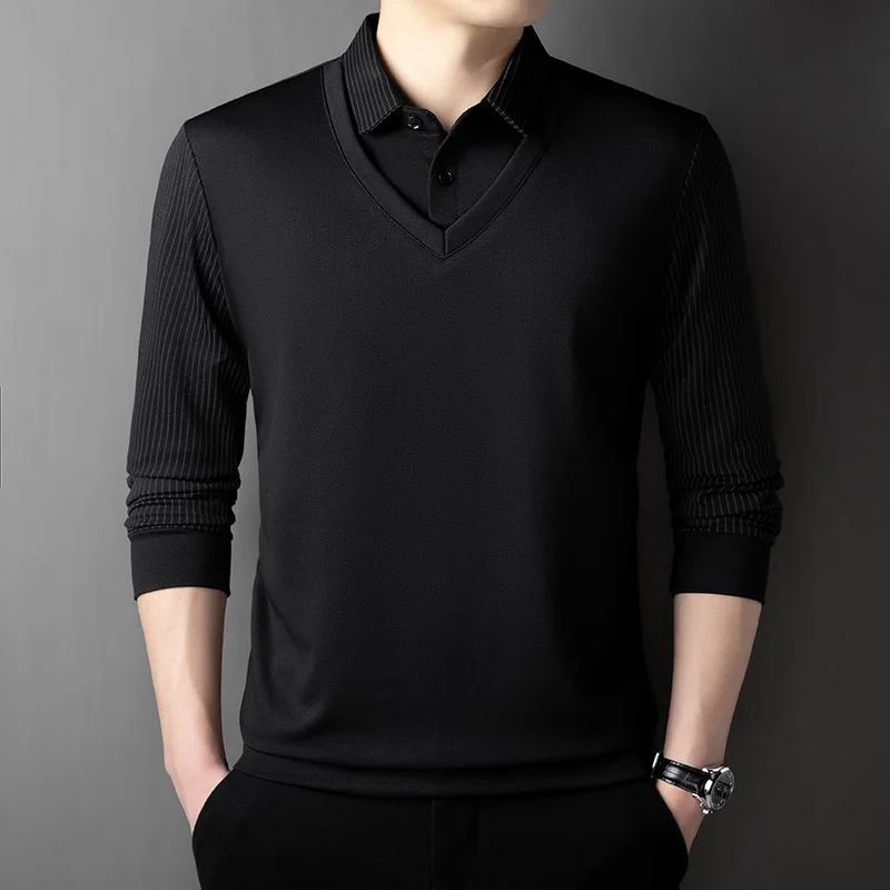 2025 New Men's Casual and Fashionable Long Sleeved Solid Color Fake Two-piece Polo Shirt Business All Season Versatile Top