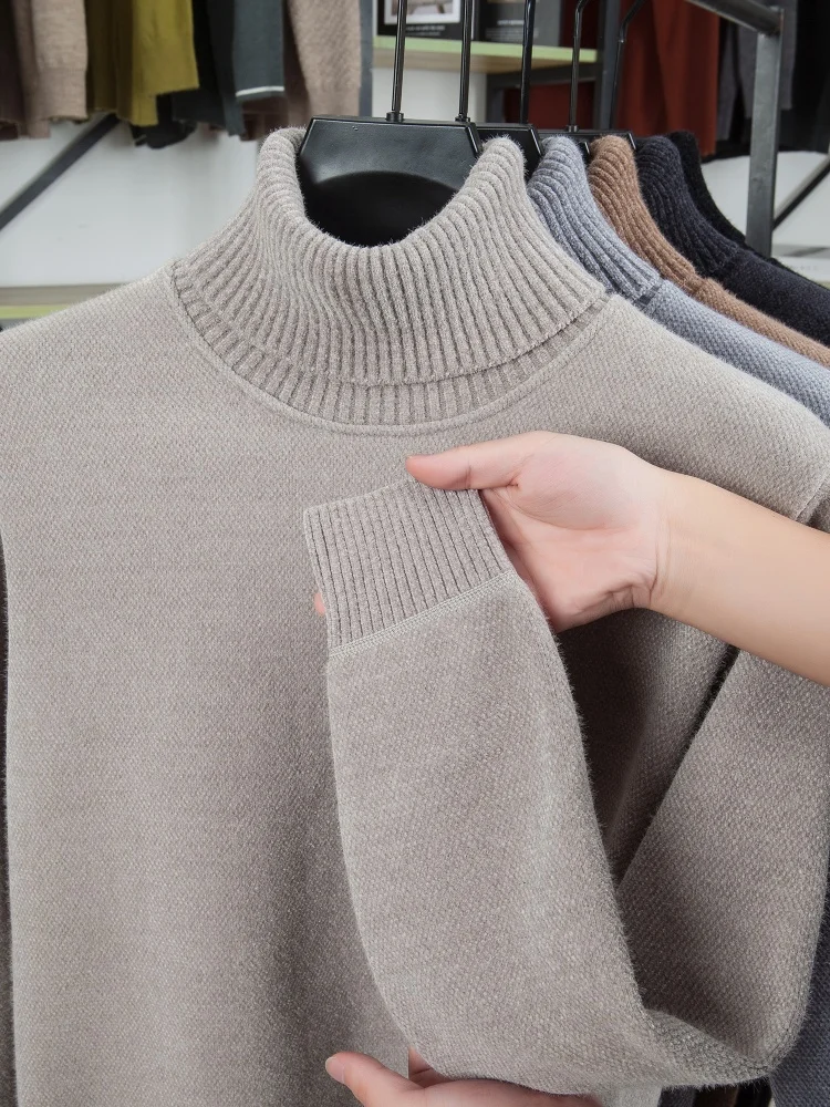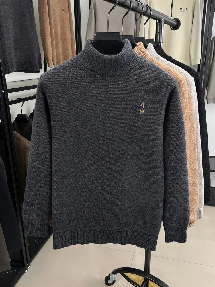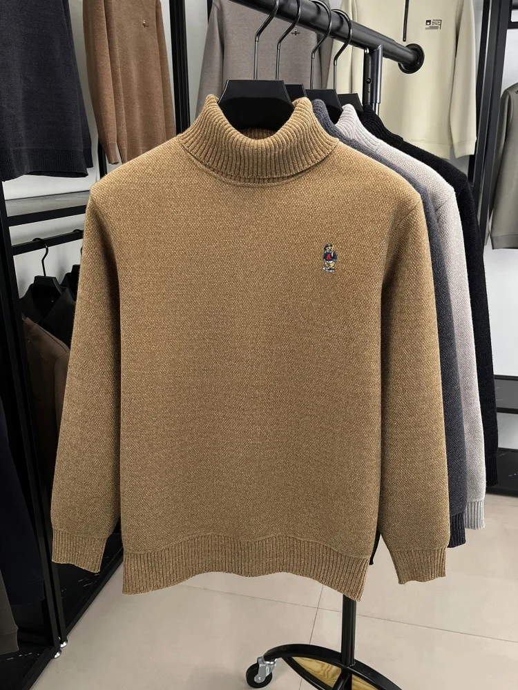 Light luxury men knitted high neck sweater new trend brand cartoon bear embroidery soft plush thicken casual versatile pullover